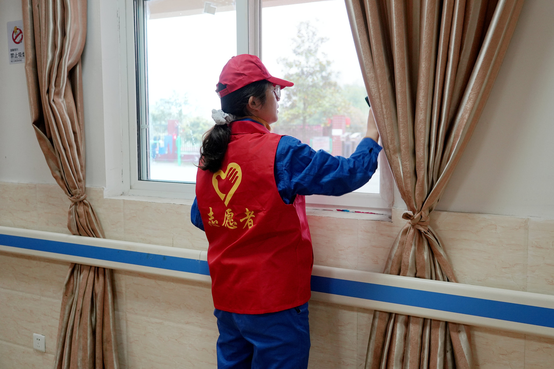 志愿者们携带清洁工具与诚挚问候抵达敬老院。在简短的沟通与分工后,大家迅速投入劳动。活动现场,志愿者们热情高涨,分工明确,配合默契:有的手持抹布,仔细擦拭走廊扶手、窗户玻璃与公共活动区的桌椅,不放过任何一个卫生死角;有的挥动扫帚与拖把,认真清扫院落里的落叶与尘土,让庭院重现整洁面貌。春日的阳光洒在忙碌的“红马甲”身上,汗水与笑容交织,敬老院里处处涌动着青春的暖流。